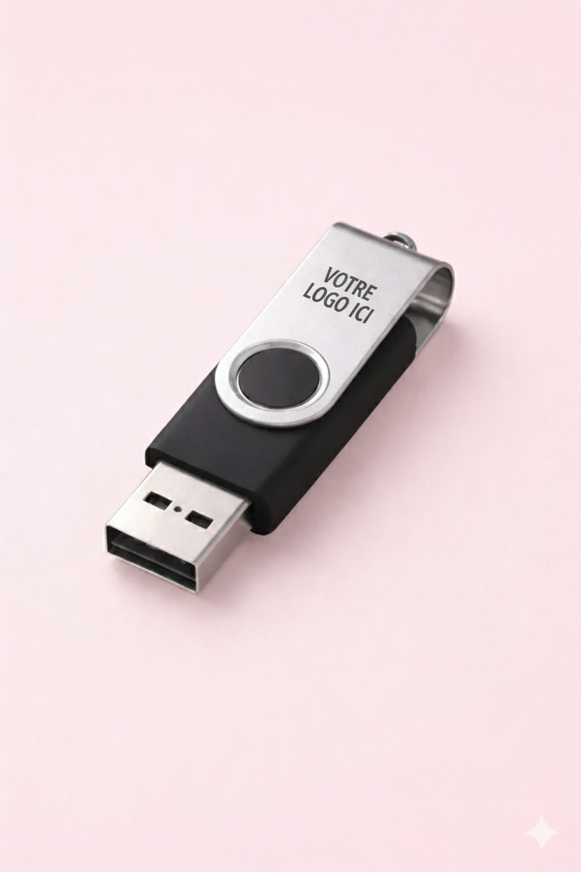 Clé USB rotative personnalisée, pratique et élégante, idéale pour vos cadeaux d’entreprise, événements et usages professionnels. Personnalisation avec logo ou texte.